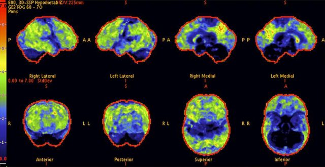 Above:The before PET scan of a 68-year-old woman with a 10-year history of cognitive difficulties shows prominent hypometabolism with a pattern suggestive of Alzheimer’s disease