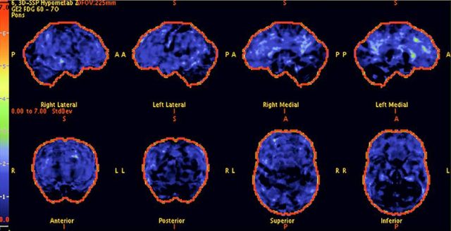 Above:The after PET scan of the patient after treatment with inhibitor (RI). As the scan gradually approach that of a normal brain, the patient’s cognitive abilities improved dramatically.
